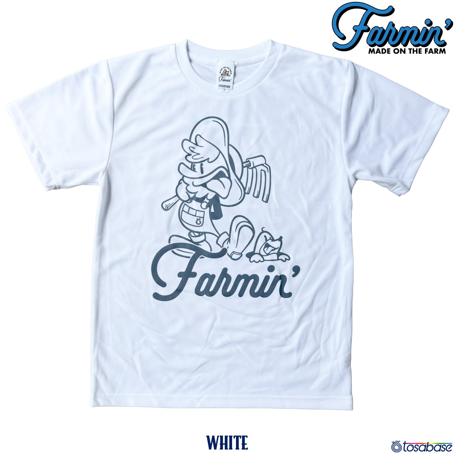 前面にFarmin'のロゴと、メインキャラクターである農夫のティオとモグラのルナールが大きくプリントされたシャツ。