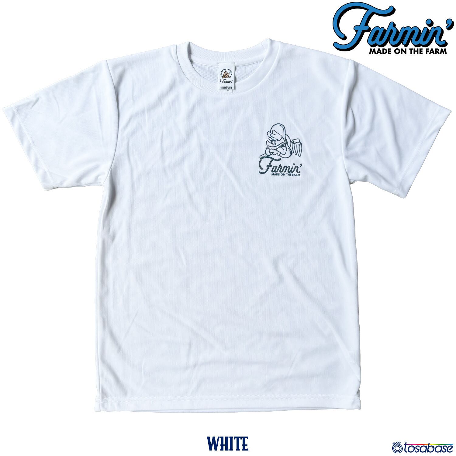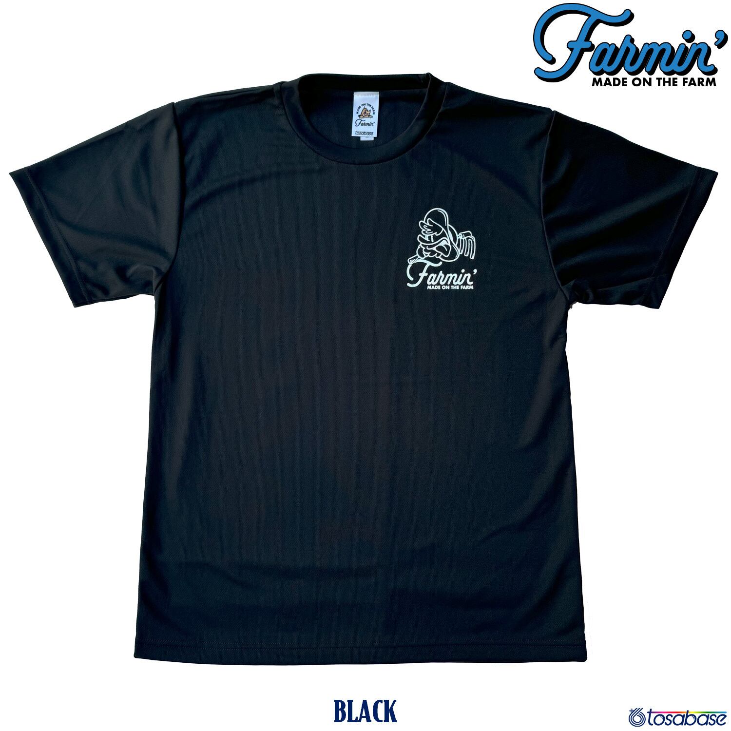左胸にFarmin'のロゴと、メインキャラクター「ティオ」がプリントされたシャツ。
